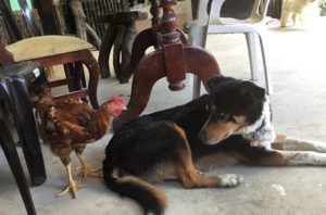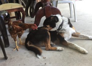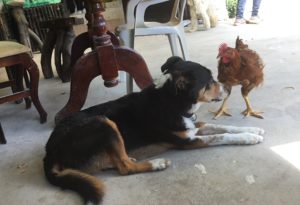 This girl doesn’t know she’s a chicken – she hangs out with the dogs. Mali wasn’t quite sure about this new friend, but she just let it do it’s thing. Who wouldn’t let a chicken take a fly off your back??? LOL