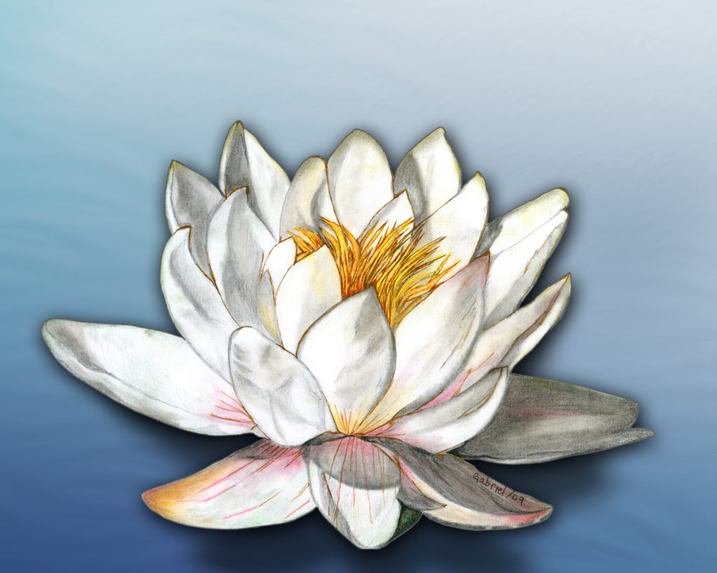 The lotus; a bit of a challenge because it is white, so I had to learn to draw a white flower on white paper. Should be easy, right?