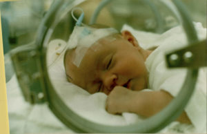 The spinal tap was how they discovered her illness. It is hard to express how helpless I felt sitting there. Because I could not hold her, I just put my hand on the glass and prayed she would come out of this ok. The next morning when I went to visit her I began to look around and was rather shocked at what I saw beside me in the adjacent incubator. The nurse had explained to me this child was a twin born prematurely, her sister on the other side of the ward was doing much better. This one however was still critical. And of course looking at her it was obvious why: her skin was transparent and I could see and the most remarkable thing, I was seeing the beating of her tiny little heart.