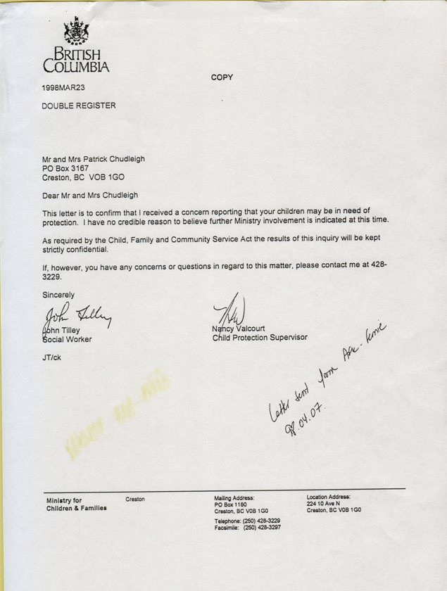 Several years later (after the three children no longer lived at home) I received a letter from Ellen filled with bizarre accusations such as me being on drugs, being mentally unstable, walking around unkempt with greasy hair etc. all of which only confirmed in my mind she had much to do with the events in Creston a few years prior. These new allegations were strikingly similar to those the social worker John Tilley presented to us. Now the children were no longer under our roof she seemed strangely compelled to threaten me in order to keep me away from them, unless of course I surrendered my relationship with Patrick and Lucas. If I left them I would be allowed to come back to The Family.